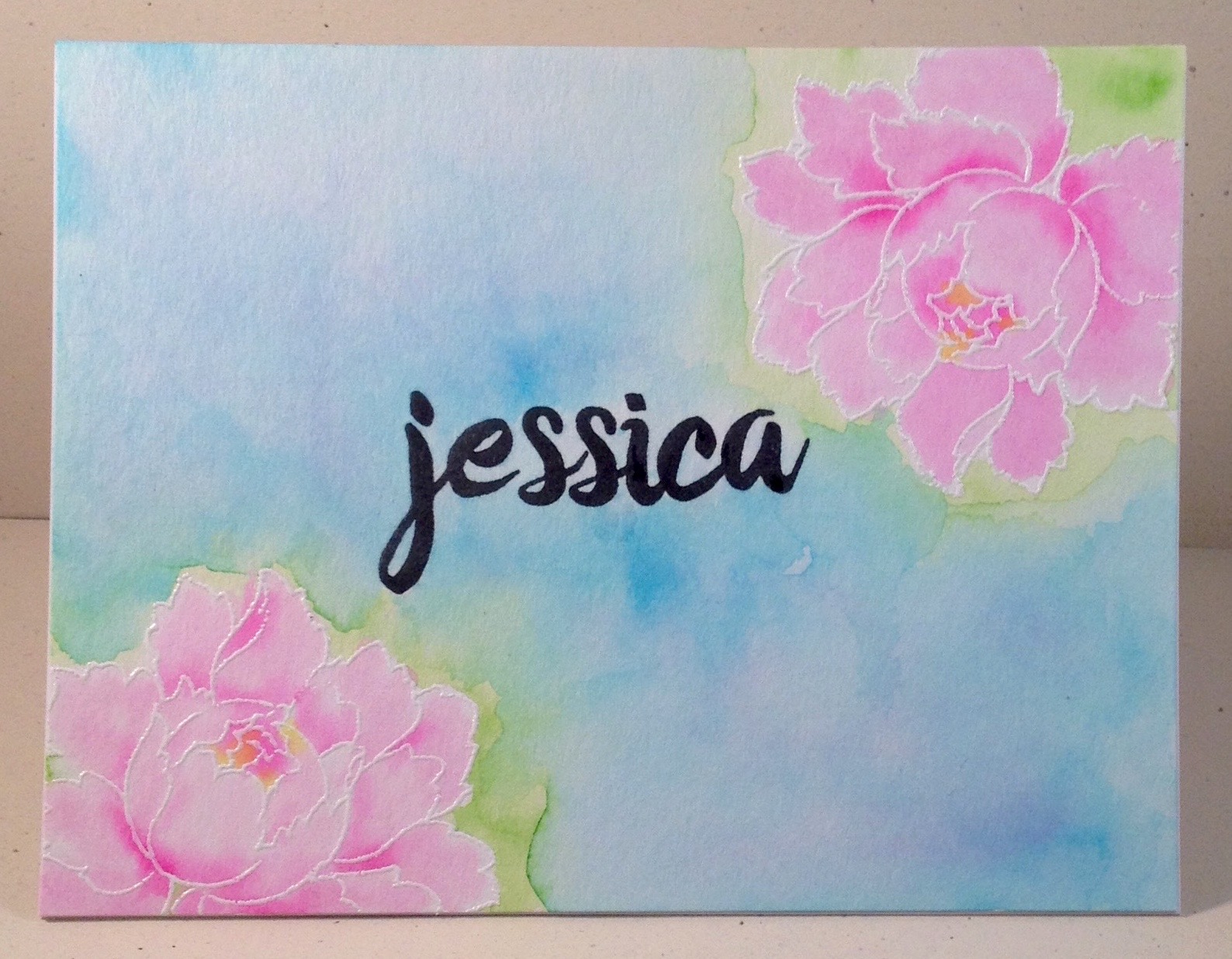 I was inspired by her two flowers, the large black sentiment, and the watercolory look. Where Tracey used watercolor powders, I just used my Zigs. All stamps are Altenew, and I white embossed the blossoms before watercoloring. I love this Peony Bouquet set, and the Calligraphy Alpha, too. Hope she likes it!