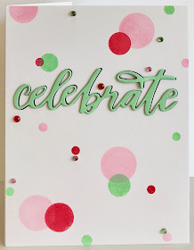I found various circle stamps in my stash and used ME pink and red inks, and the green is a DO in pistachio. I cut the SC sentiment twice; once in black and once in mint and off set them slightly. A few blings in the same colors finishes it off nicely. Looks happy to me.